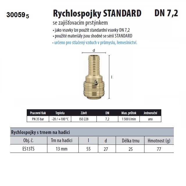 | Použití produktu | Spojka pro vzduch a vzduchové rozvody DN 7,2 |