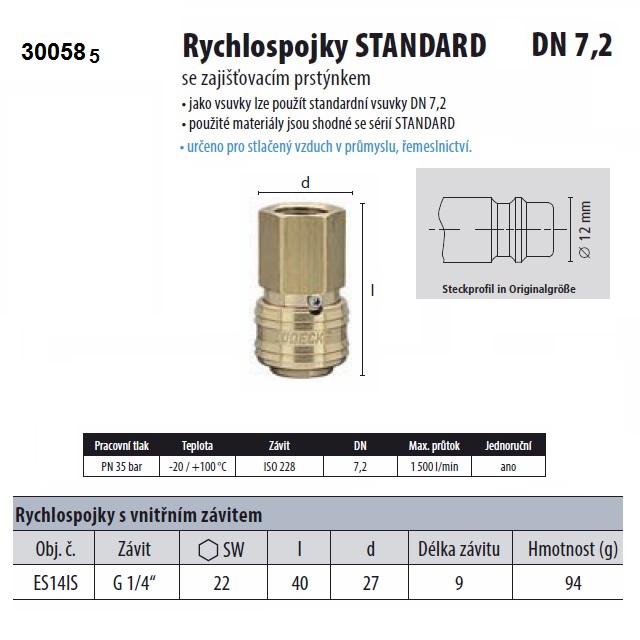 | Použití produktu | Spojka pro vzduch a vzduchové rozvody DN 7,2 |