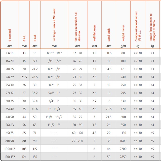 | Kód | Určeno na hadici [mm] | Vnější rozměr (mm) | Vnitřní rozměr (mm) | Síla stěny hadice (mm) | Hmotnost (kg) | Balení [MJ] | Vnější průměr (mm) | Vnitřní průměr (mm) | MJ | Cena / MJ | |