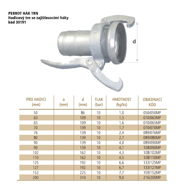 | Kód | Určeno na hadici [mm] | Provozní tlak (bar) | DN (mm) | Hmotnost (kg) | Balení [MJ] | Výška | MJ | Cena / MJ | |