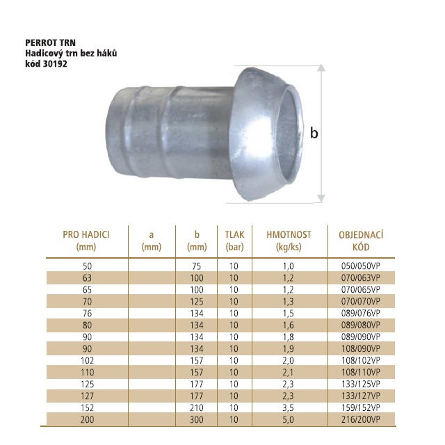 | Kód | Určeno na hadici [mm] | Provozní tlak (bar) | DN (mm) | Hmotnost (kg) | Balení [MJ] | Výška | Provedení | MJ | Cena / MJ | |