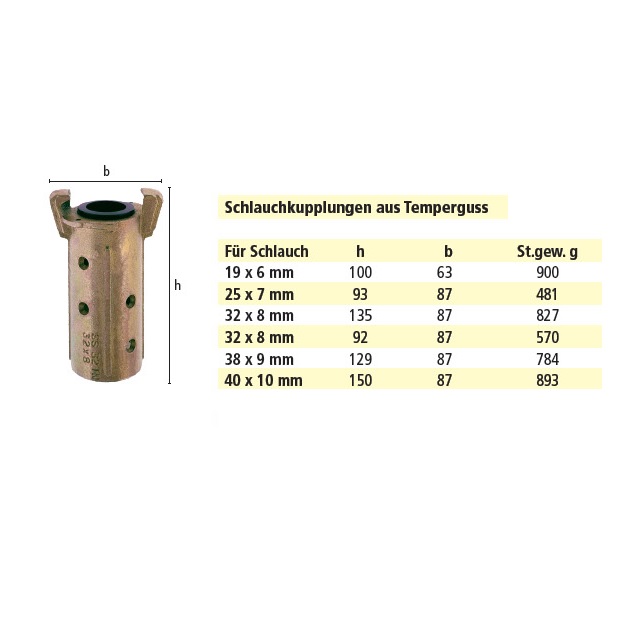 | Kód | Určeno na hadici [mm] | Celková délka (mm) | Provozní tlak (bar) | Vnitřní rozměr (mm) | D.* (mm) | Hmotnost (kg) | Balení [MJ] | Výška | Vnitřní průměr (mm) | MJ | Cena / MJ | |