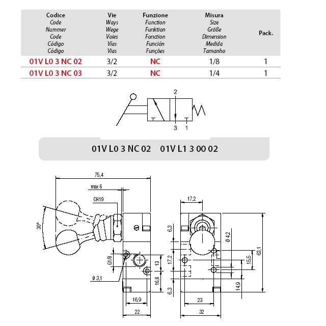 ventil A1MA232LL 3/2 páčka 90° 1/4 s aretací |
