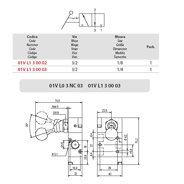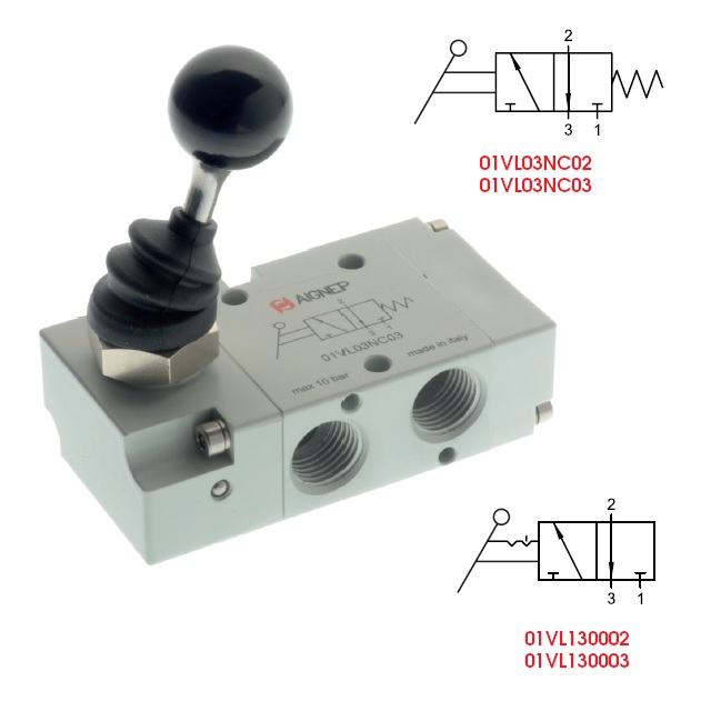 ventil A1MA132LL 3/2 páčka 90° 1/8 s aretací bistabil |